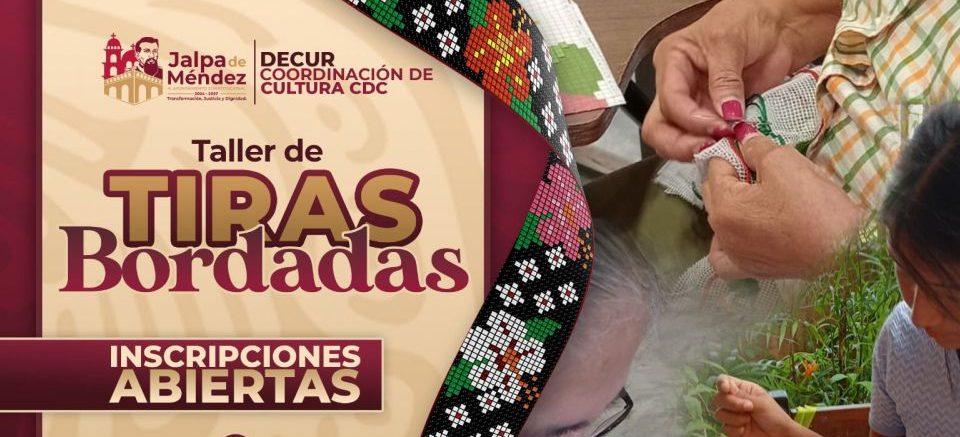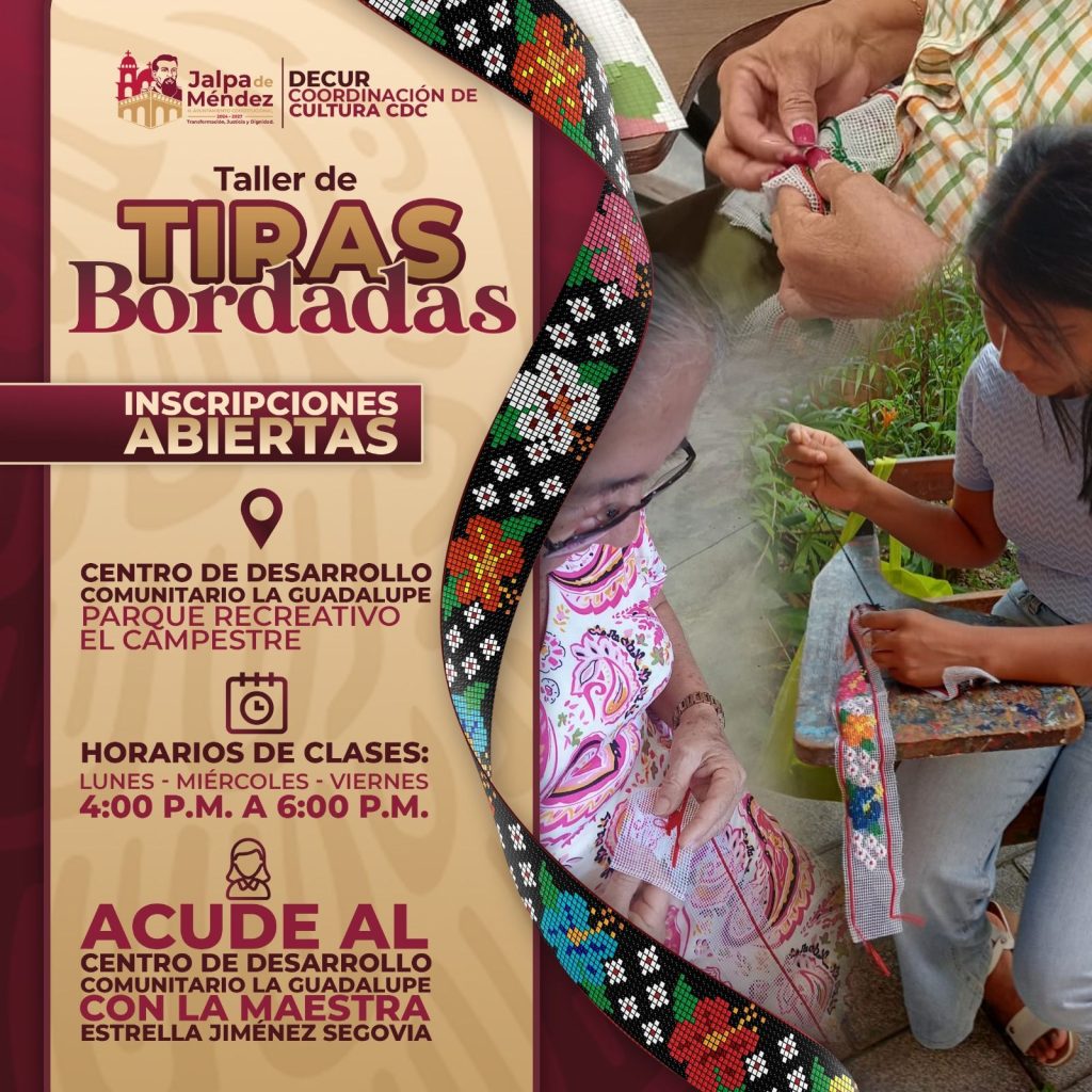 El Ayuntamiento de Jalpa de Méndez, a través de la DECUR Municipal y la Coordinación de Cultura CDC, te invita a aprender y disfrutar del arte del bordado en nuestro Taller de Tiras Bordadas.