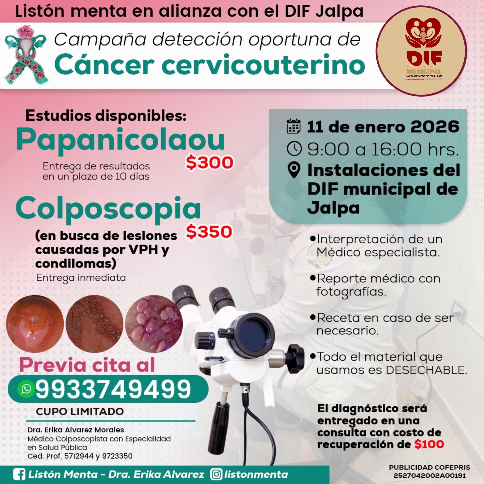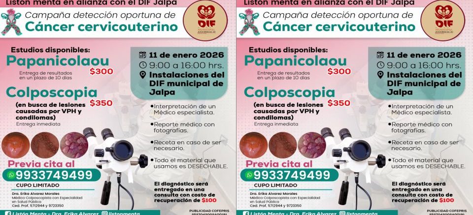 El DIF Municipal de Jalpa de Méndez invita a la ciudadanía a participar en la Campaña de Detección Oportuna de Cáncer Cervicouterino, como parte de las acciones preventivas para el cuidado de la salud de las mujeres.