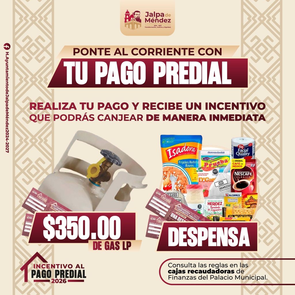 El H. Ayuntamiento de Jalpa de Méndez, a través de la Dirección de Finanzas, informa a las y los contribuyentes del municipio que, a partir del 20 de enero y hasta el 27 de febrero de 2026, al realizar su pago del impuesto predial podrán recibir un incentivo.