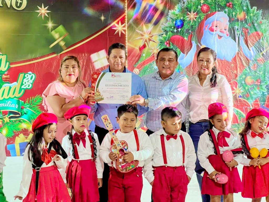 En representación del Presidente Municipal, Lic. José del Carmen Olán Olán, el Secretario del Ayuntamiento, Lic. Manuel Sastré de Dios, y la Directora de la DECUR, Tec. Flor de Liz Jiménez Ovando, realizaron la entrega de un reconocimiento a la Escuela Primaria “Leandro García Alfaro”, por su destacada participación dentro del Foro Artístico Navideño.
