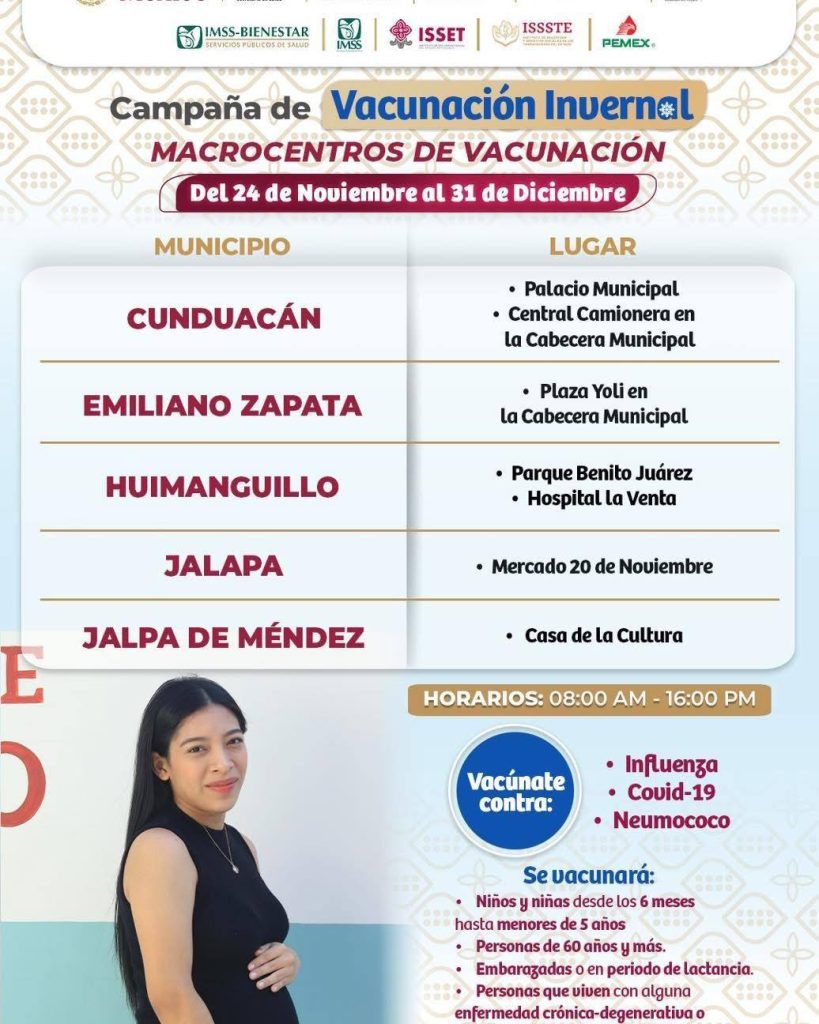 Del 24 de noviembre al 31 de diciembre se desarrolla la Campaña de Vacunación Invernal en Jalpa de Méndez. ![]()