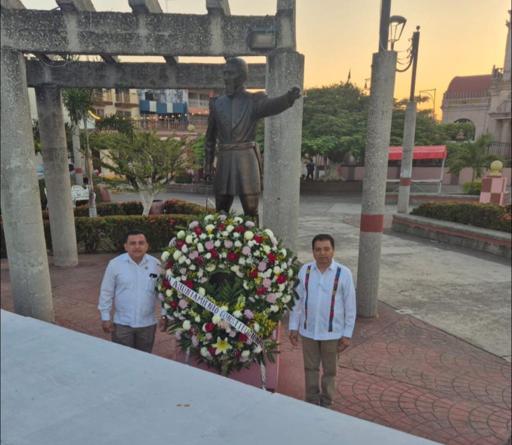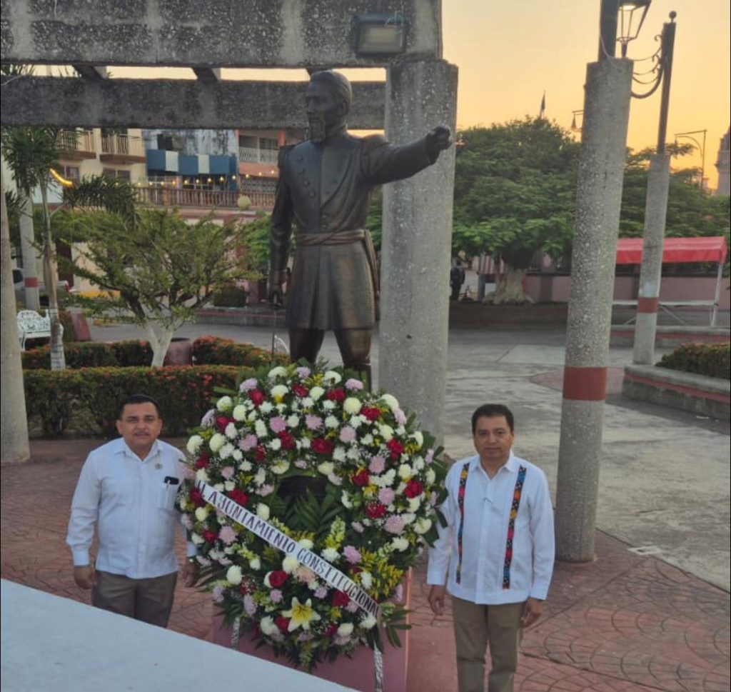 En el marco del CLXII aniversario de la Gesta Heroica del 27 de febrero, el Secretario del Ayuntamiento, Lic. Manuel Sastré de Dios, y el Dr. Jorge Luis Domínguez Vega, organizador de eventos cívicos y enlace con el sector educativo, colocaron una ofrenda floral y montaron guardia de honor en el monumento al Gregorio Méndez Magaña, en el Parque Central de Jalpa de Méndez.