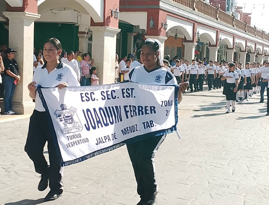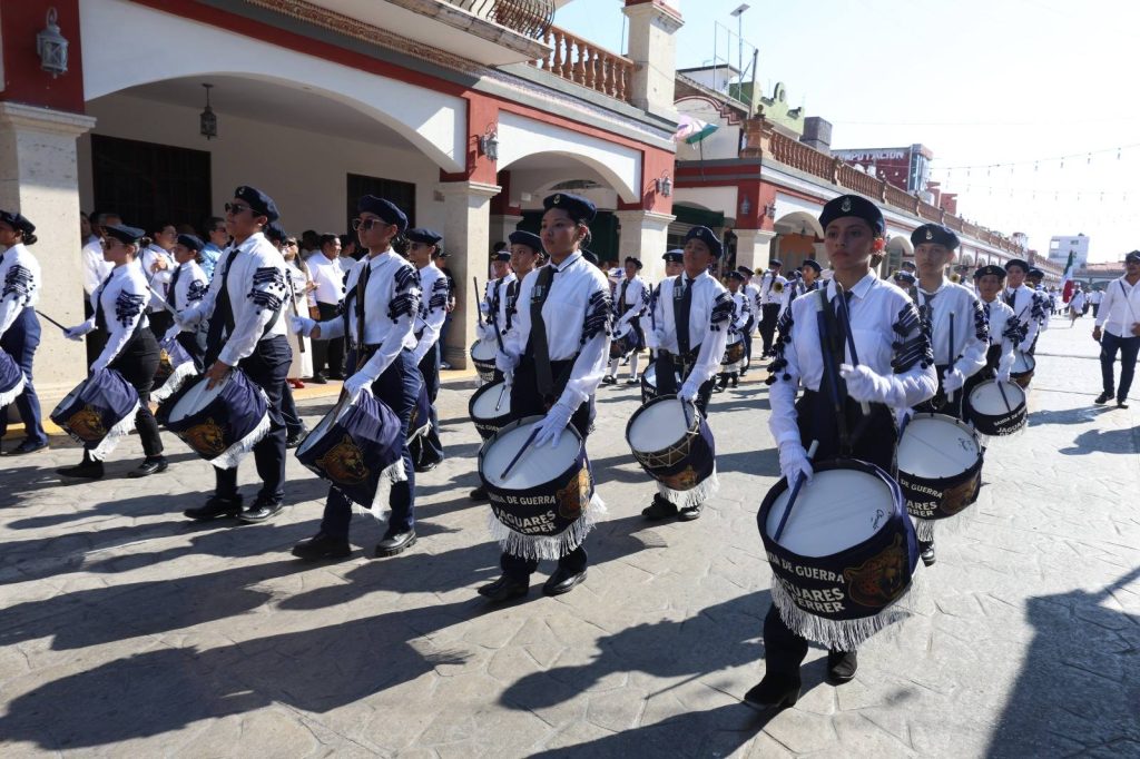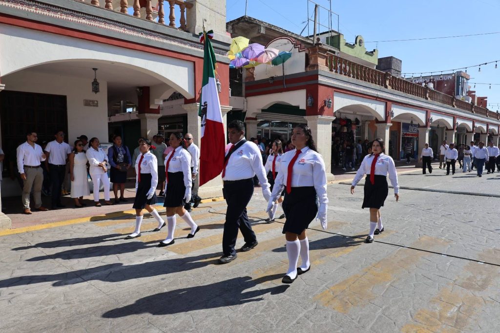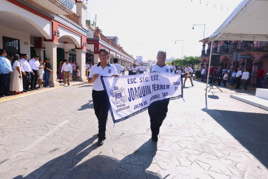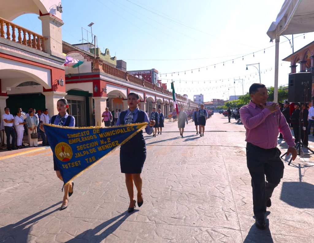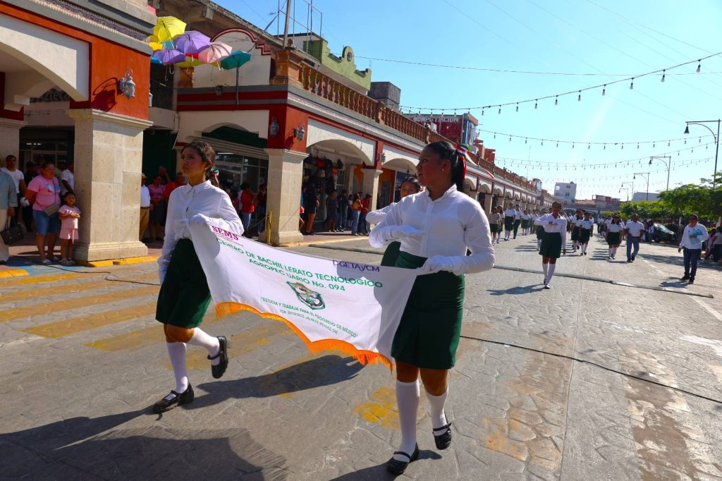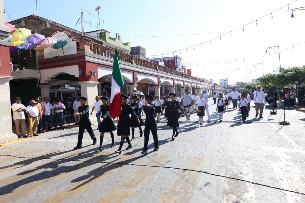 El desfile recorrió la calle Constitución hasta la Plaza Hidalgo, con la participación de instituciones educativas, organizaciones y trabajadores, culminando con una cabalgata que fortaleció el orgullo e identidad de Jalpa de Méndez