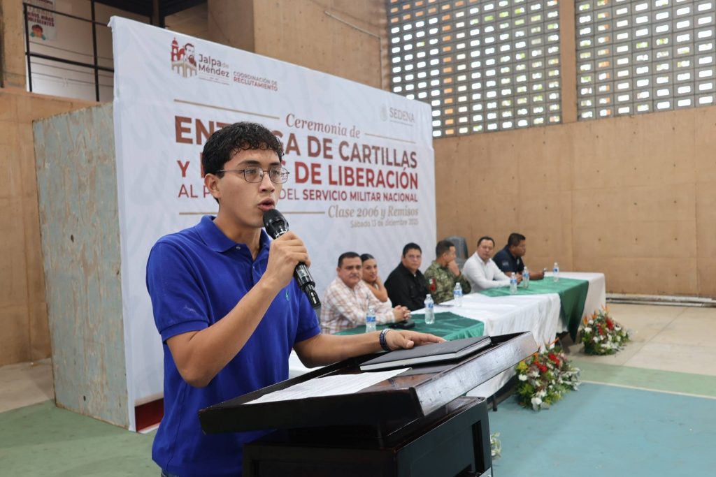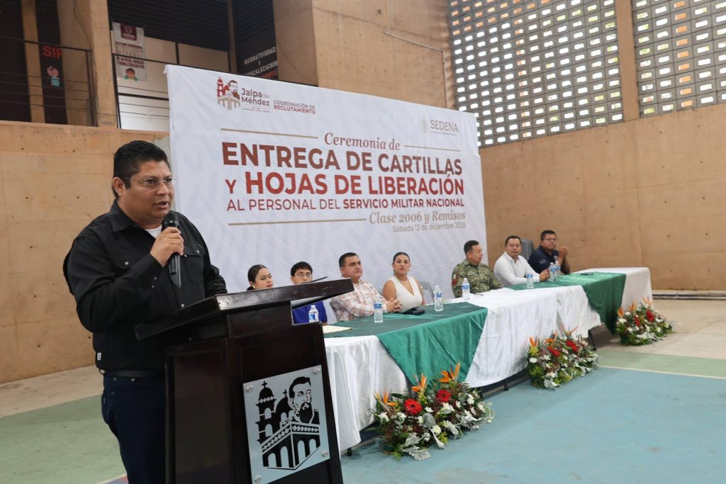 En el Polideportivo Municipal se llevó a cabo hoy sábado 13 de diciembre la Ceremonia de Entrega de Cartillas y Hojas de Liberación del Servicio Militar Nacional a jóvenes de la Clase 2006 y remisos del municipio de Jalpa de Méndez, reafirmando el compromiso cívico y la formación en valores de la juventud.