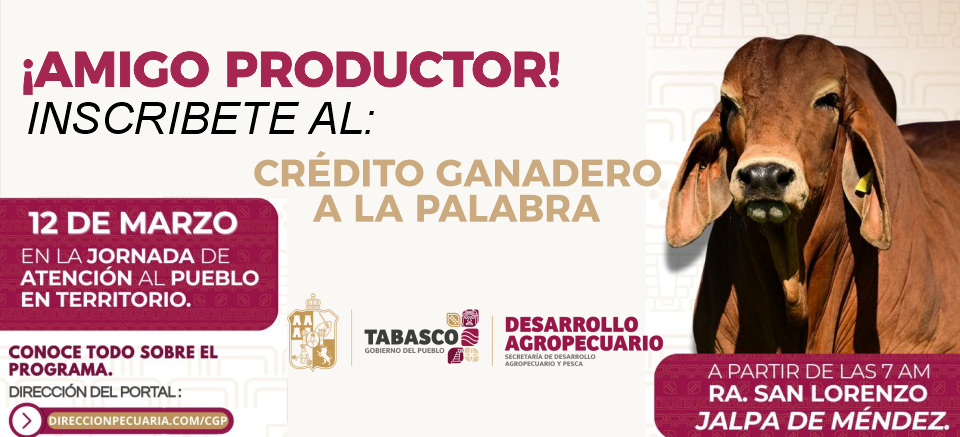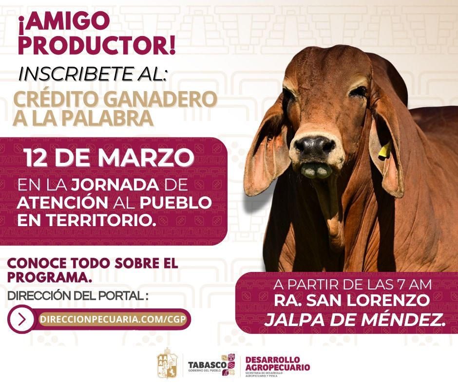 Atención, productores de Jalpa de Méndez diciembre 28, 2025 admin En la Jornada de Atención al Pueblo en Territorio, este 12 de marzo en la Ranchería San Lorenzo podrán registrarse y conocer los beneficios del Crédito Ganadero a la Palabra. A partir de las 7:00 a.m. #JalpaDeMéndez #CampoFuerte