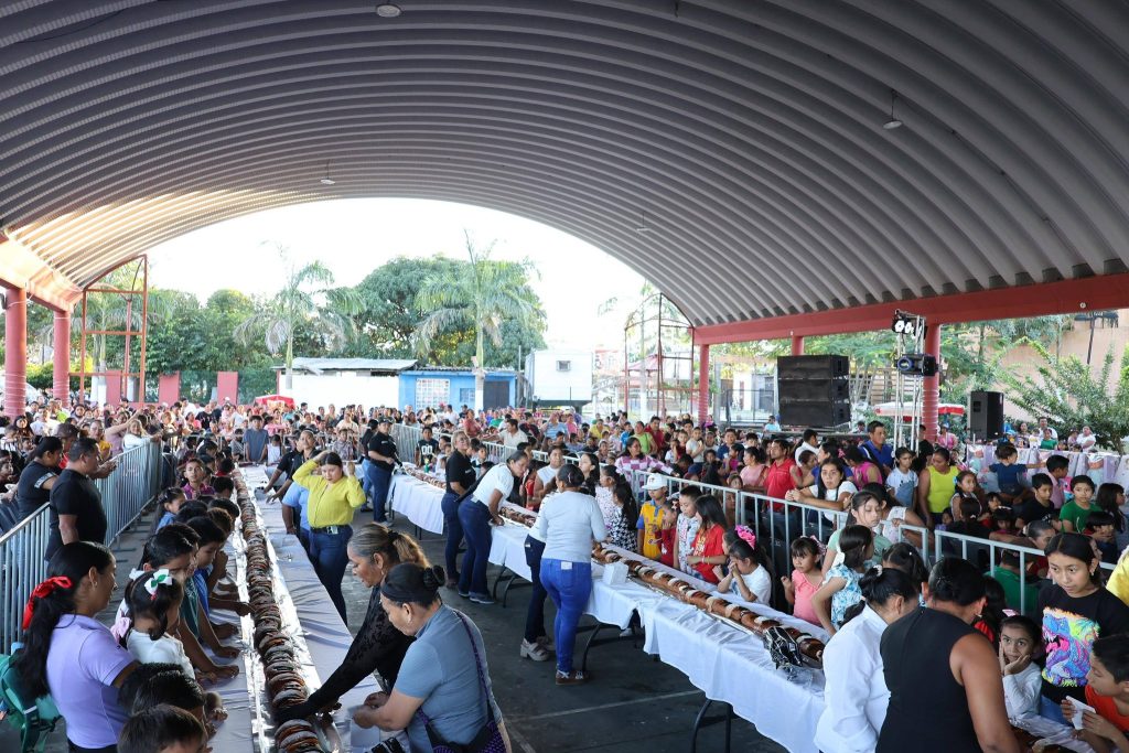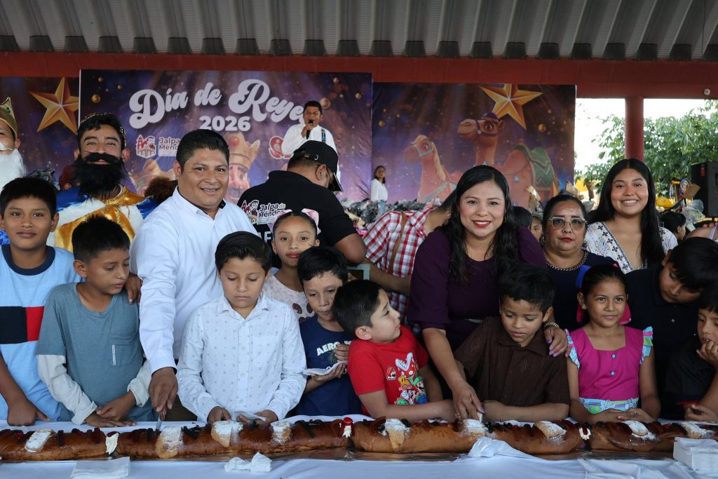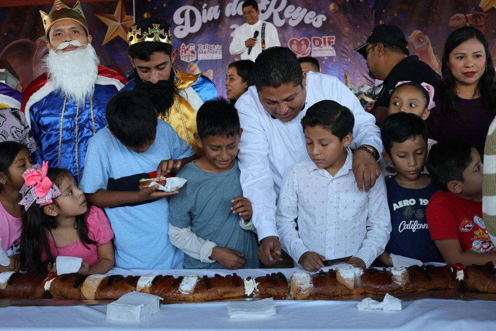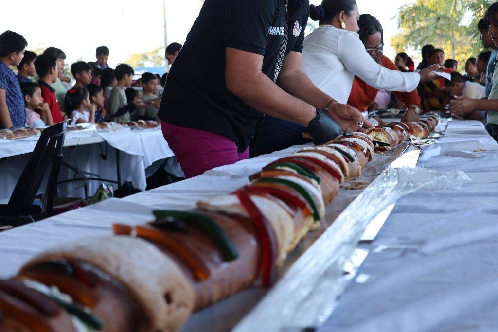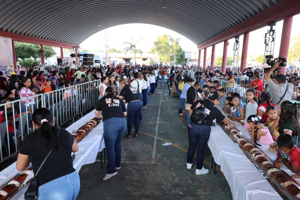 Rebanadas de rosca y chocolate se reparten entre sonrisas, juegos y convivencia, en un ambiente que refuerza las tradiciones y acerca el gobierno a las familias.