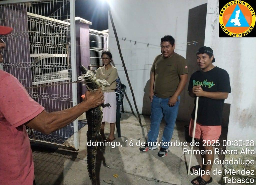 El Ayuntamiento de Jalpa de Méndez, a través de la Unidad Municipal de Protección Civil, atendió oportunamente el reporte de una familia de la Ranchería Rivera Alta, donde un lagarto de aproximadamente 1.25 metros ingresó a su domicilio.