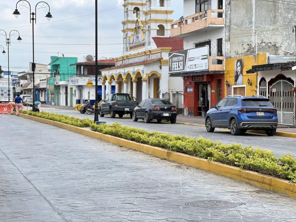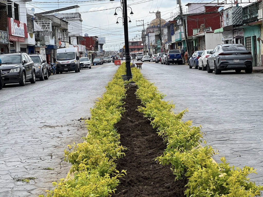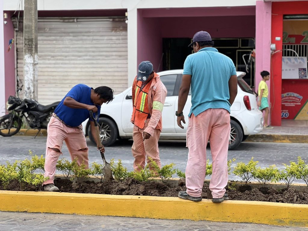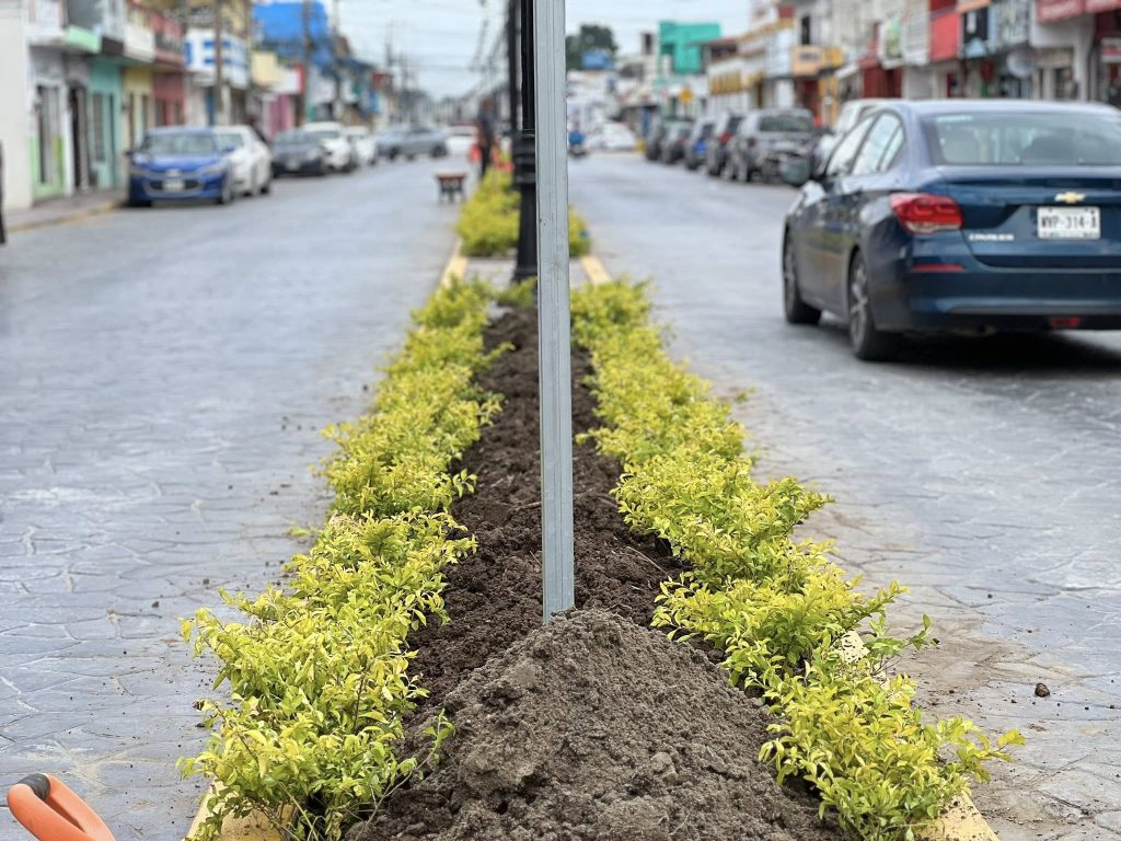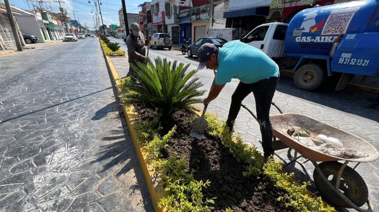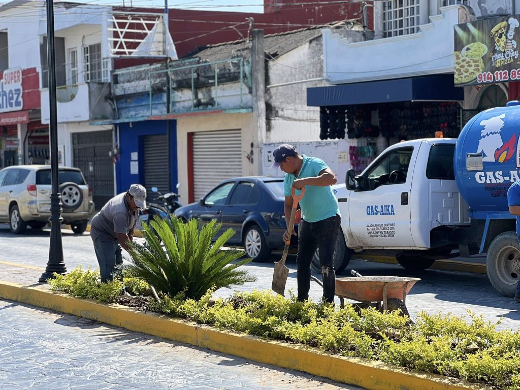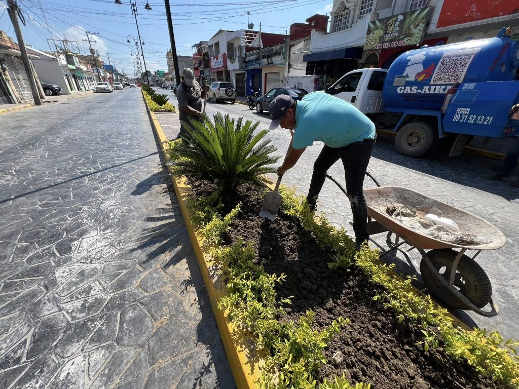 El H. Ayuntamiento que encabeza el presidente municipal Lic. José del Carmen Olán Olán realiza la restauración de áreas verdes en la calle Constitución, del tramo Plaza Hidalgo a calle Nicolás Bravo, en el Barrio La Guadalupe.