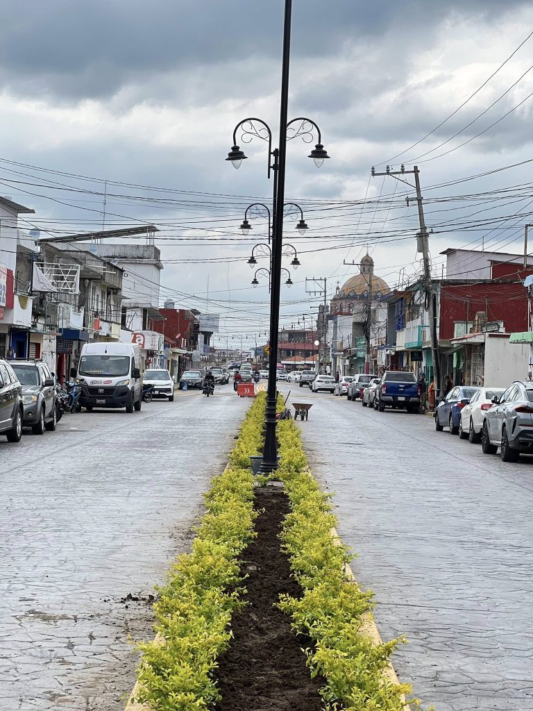 En esta acción se llevan a cabo trabajos de jardinería y embellecimiento con plantas Duranta verde y morada, Palma Cica y Jícara, decoradas con piedra volcánica blanca, guinda y negra, realzando la imagen urbana de una de las principales vialidades del municipio.
